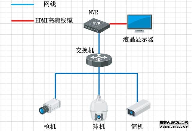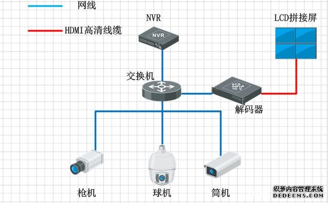 小型的監(jiān)控系統(tǒng)組成非常簡單,通常就是前端幾個攝像頭,然后接交換機(jī),交換機(jī)接NVR,NVR直接連接顯示器,直接在顯示器上預(yù)覽畫面,NVR的解碼能力比DVR的解碼能力更強(qiáng),現(xiàn)在普通的NVR都是支持1-8路的1080P的攝像頭解碼,但最近幾年也出現(xiàn)幾款的高端NVR,集成更加強(qiáng)大的解碼功能,但絲毫未改變NVR就是存儲的產(chǎn)品,所以一般通過NVR顯示,都是應(yīng)用在一些低端,點(diǎn)位數(shù)較小的項(xiàng)目中,比如超市和店鋪這類預(yù)算較低的項(xiàng)目。同DVR顯示一樣,普通的NVR的監(jiān)控上墻也會遇到畫面切換控制不方便,且不支持視頻畫面開窗漫游等功能。