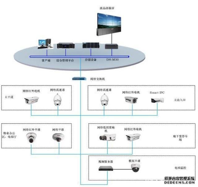 本系統(tǒng)采用大華智能小區(qū)綜合管理平臺,具備視頻監(jiān)控系統(tǒng)管理模塊,可通過網(wǎng)絡(luò)來管理網(wǎng)絡(luò)硬盤錄像機(jī)機(jī)(NVR),前端攝像機(jī)或編碼器。綜合管理平臺配備高性能嵌入式服務(wù)器,可支持大量高清攝像機(jī)實時顯示、云臺控制,錄像操作、回放等功能。